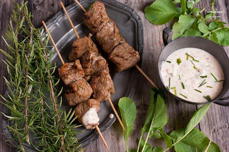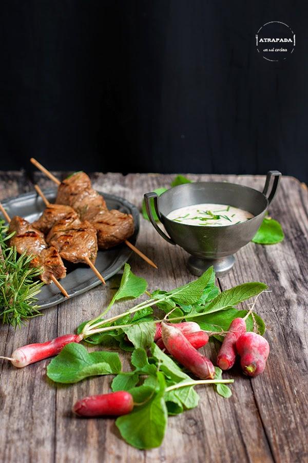 Para preparar la salsa batimos el yogur o nata (crema de leche) fresca, con dos cucharadas de rábano recién rallado, la mostaza de Dijon, la sal y el cebollino, dejando algunos cebollinos para decorar la salsa por encima. Calentamos una salsa o parrilla y ensartamos tres o cuatro trozos de carne en cada palillo. Llevamos al fuego, dándole vuelta pasados unos minutos, dejando que se hagan por todos lados a fuego medio alto para que queden doradas por fuera y menos hechas por fuera (dependerá también del punto de cocción que le queráis dar a la carne). Servimos acompañadas de la salsa de rábano.