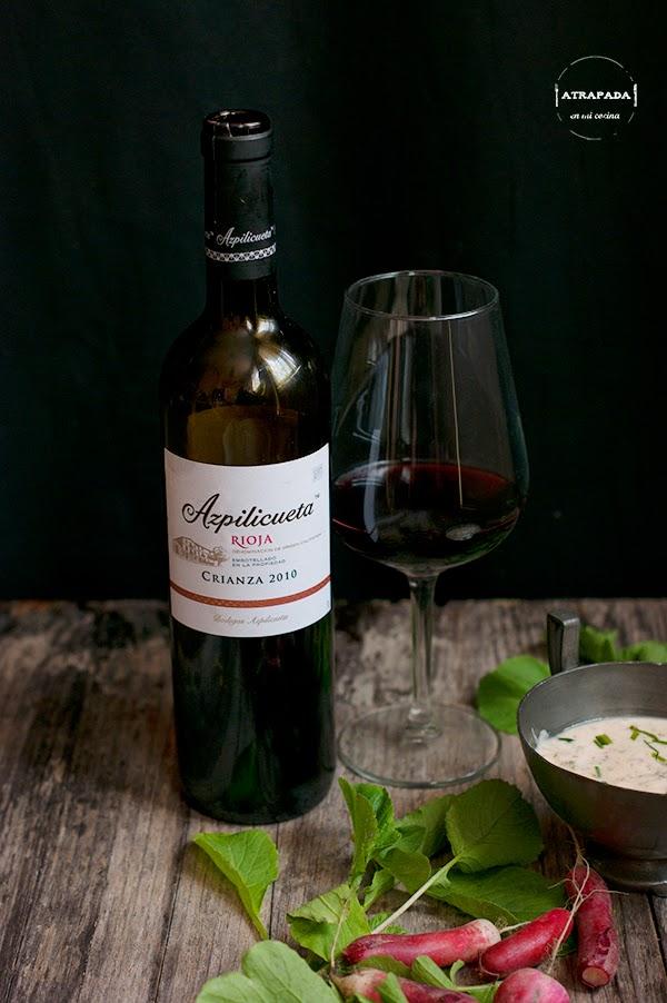 Hemos acompañado el plato de Azpilicueta Crianza de 2010. Un vino de uvas Graciano, Mazuelo y Tempranillo. "De color rojo cereza, de buena intensidad, vivaz con destellos dorados. Limpio y brillante. La nariz es perfumada donde destacan las notas de fruta, sobre un fondo de madera tostada y suaves aromas de vainilla, coco y especias". Es un vino criado en barricas de roble francés y americano durante 12 meses y completa su envejecimiento 6 meses, como mínimo, en botella. Es ideal para acompañar, embutidos, arroces, setas, verduras, carnes blancas y rojas. El precio de mercado oscila entre 7 y 8 euros.