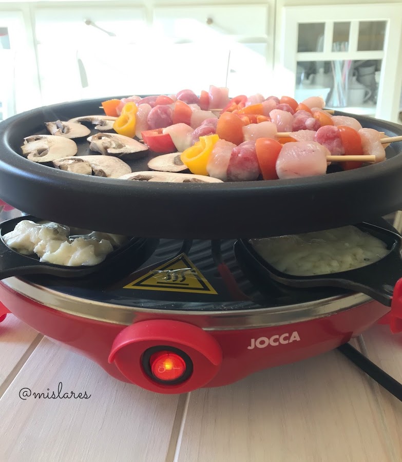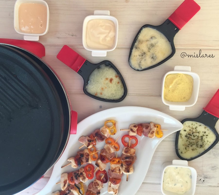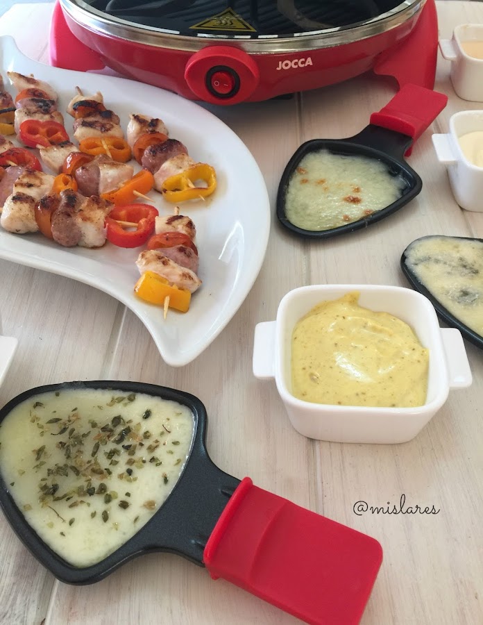 4 Calentamos la raclette y vamos asando las brochetas que acompañaremos con las salsas y quesos.