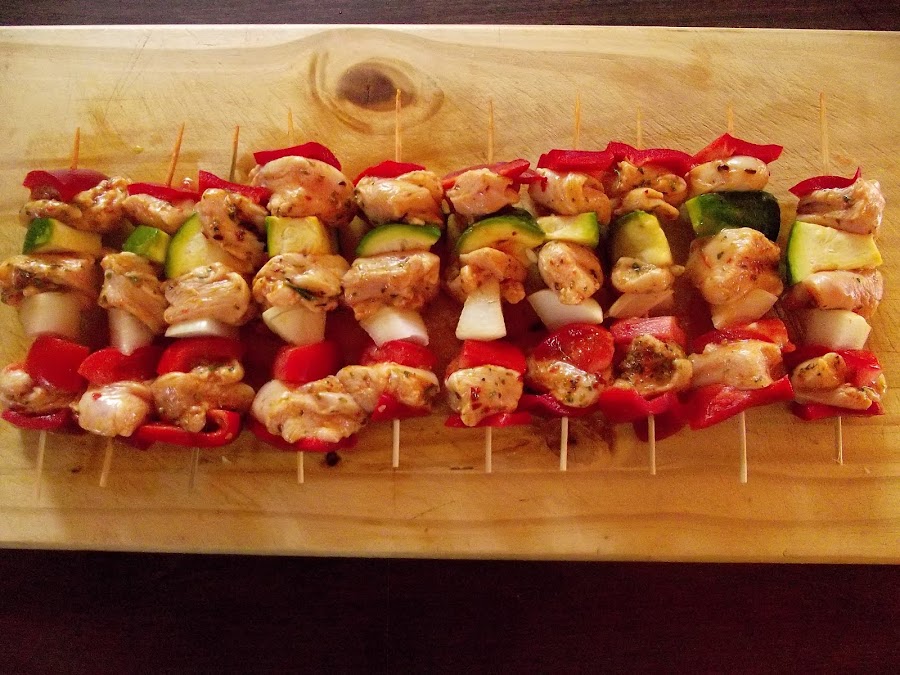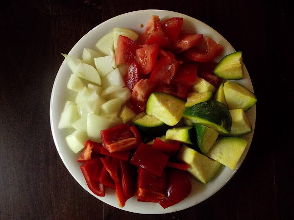 Cortar las verduras en cubos y comenzar a armar las brochettes intercalando las verduras y los cubos de pollo, yo lo armé de la siguiente manera: un morrón un cubo de pechuga, un cubo de tomate y uno de cebolla, un cubo de pechuga, un cubo de zapallito, otro cubo de pollo y lo terminé con otro cubo de morrón.