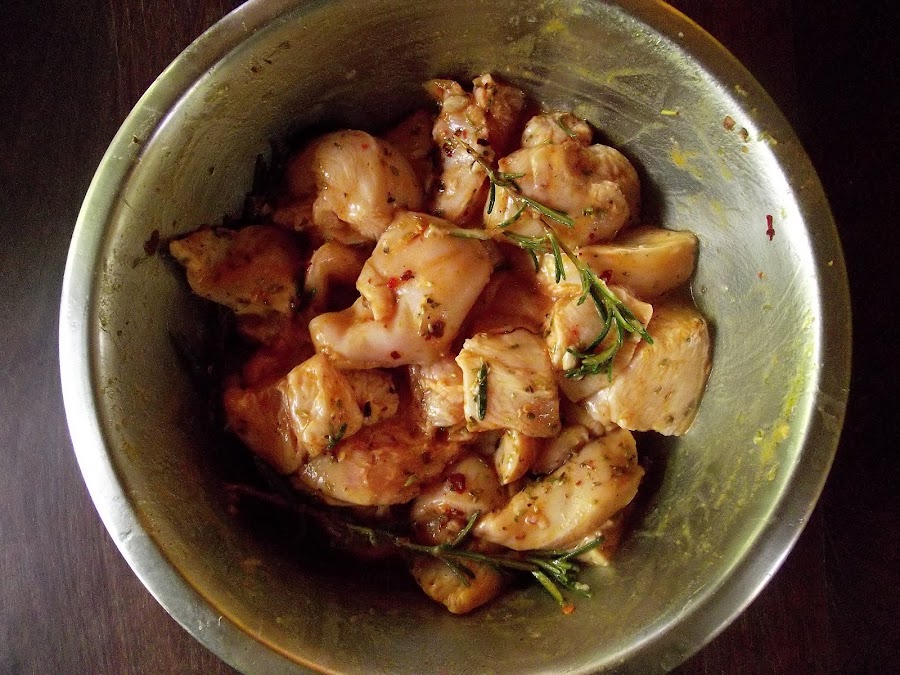 Cortar las pechugas en cubos, poner en un bowl y mezclar junto con los ingredientes de la marinada tapar con papel film y dejar en la heladera por 4 horas.