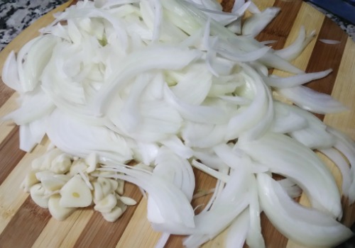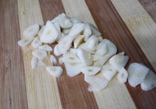 Pelamos los dientes de ajo y los laminamos también lo más fino que podamos.