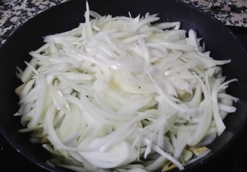 que es demasiado duro para comerlo (subiré receta de aprovechamiento de estas ramas). Después pelamos la cebolla y la picamos en juliana fina.