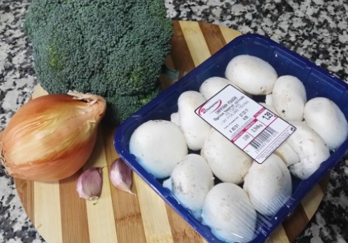 Lavar bien el brócoli y los champiñones frescos. Cortamos los champiñones en láminas, desechando la parte de abajo del tallo, la que ha estado en contacto con la tierra. El brócoli lo cortamos en forma de tiras no muy gruesas, quitando el tallo más grueso,