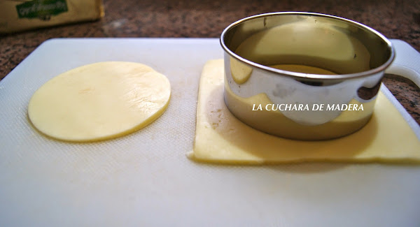 Con un aro, apretando, cortamos el queso en lonchas, reservamos