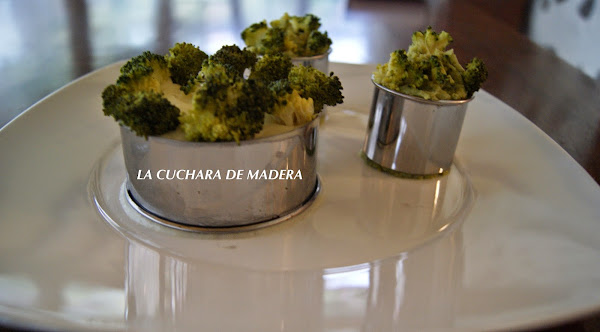 En unos aros más pequeños pondremos el bróculi triturado, presionamos para que al quitar los aros no se caigan.