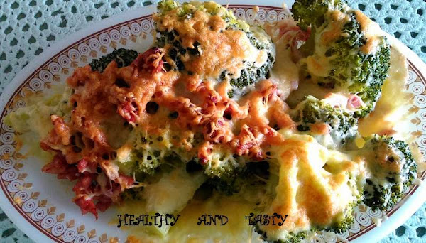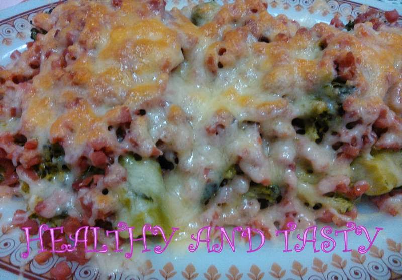 Hacemos el jamón o el bacon en el microondas poniéndolo 130 minutos + 130 minutos (3 minutos en total) a máxima potencia, o en una sartén sin aceite, lo doramos un poco. En una fuente de horno ponemos el brócoli. Lo espolvoreamos con ajo en polvo (opcional) y sal (si lo hemos hervido en el microondas o al vapor). Encima ponemos el jamón o bacon y lo cubrimos con queso rallado del que más nos guste. Lo gratinamos en el horno hasta que el queso se derrita y se dore.