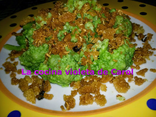 Cortamos el brócoli en ramilletes, lo lavamos y ponemos en una cazuela con agua hirviendo y un hilo de aceite de oliva durante 15 minutos, mientras tanto vamos preparando la picada crujiente de pan.