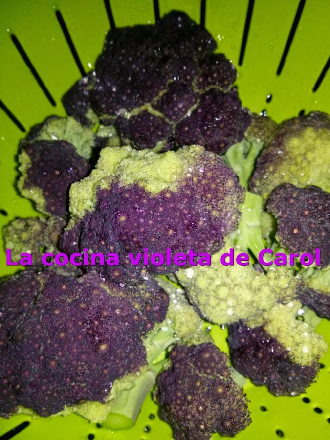 Nunca había probado el morado hasta que un día me llamaba desde el mercado ¿como es posible que no hubiese probado yo un ingrediente de mi color? La pena es que cuando lo cocina pierde ese precioso color y queda verde, un verde más intenso que el brócoli verde, eso sí, el agua donde lo hierves queda morada morada.