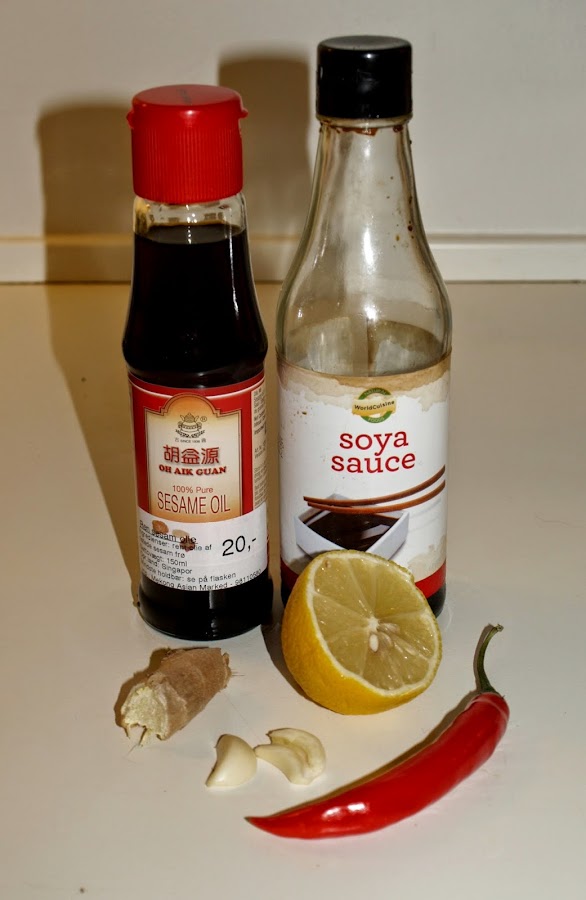 - Mientras se hace el filete, preparamos la salsa. Para ello, mezclamos en un bol la salsa de soja, el aceite de sésamo, el ajo prensado, el jengibre rallado, el chile en láminas finitas, el zumo y la piel rallada del limón.