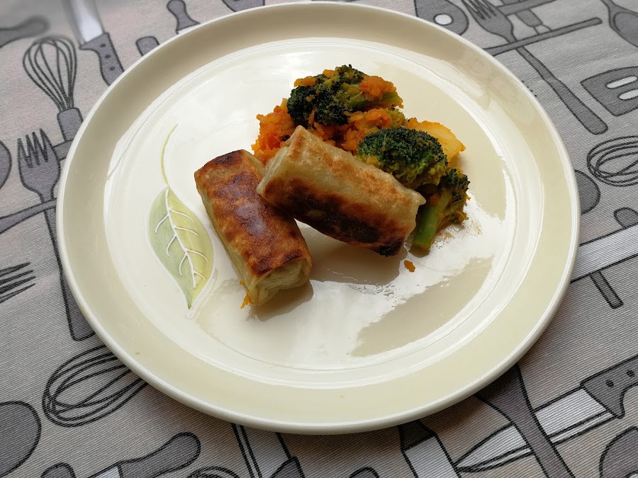 En casa contamos con Maheso, para la propuesta de hoy hemos acompañado esta rica receta con unos Rollitos de Primavera, nueva receta con masa más fina y crujiente, los hemos preparado en una sartén con un poco de aceite a fuego suave, dejando que se dore por todos los lados.