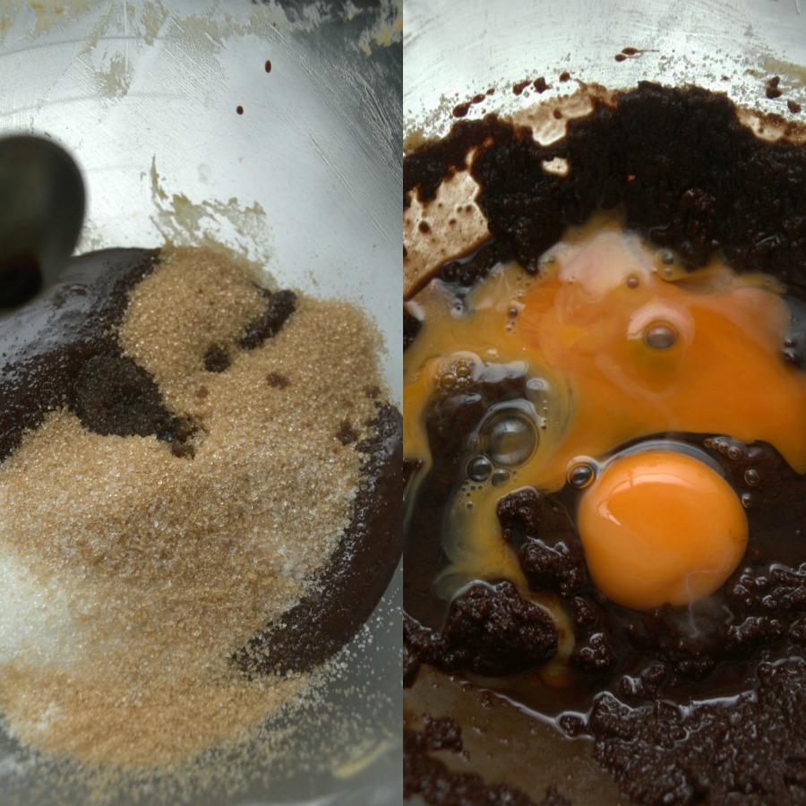 En un bol, ponemos la mezcla de chocolate, los azúcares y la vainilla y batimos bien.