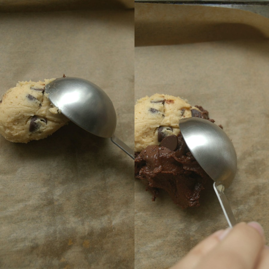 Place one tablespoonful of brownie dough next to the cookie dough.
