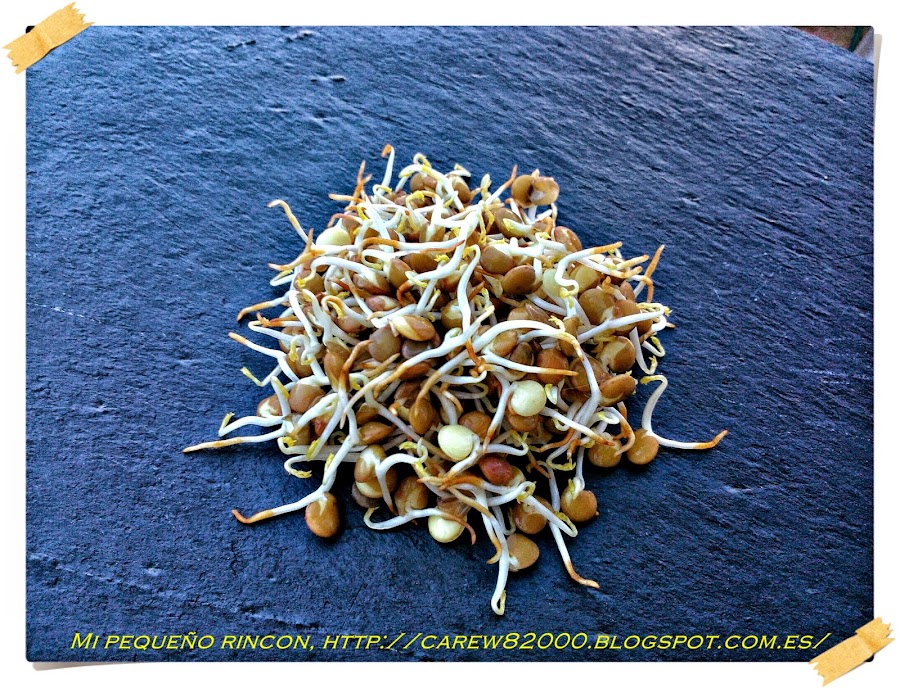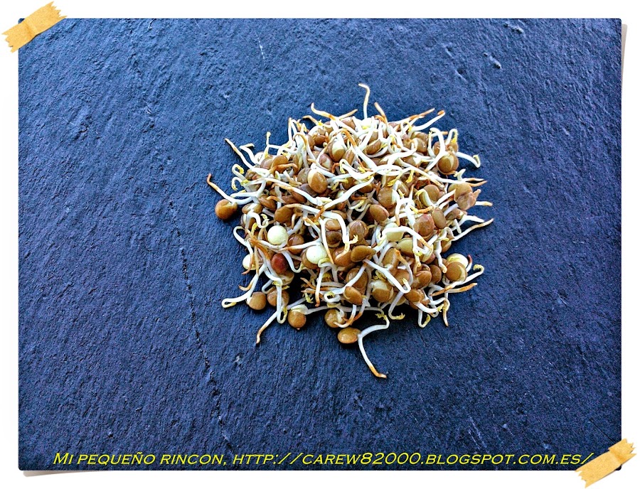 Una vez tapado el bote echamos agua hasta cubrir y enjuagamos las lentejas, luego vaciamos de agua a través de la servilleta y dejamos en un sitio seco hasta el día siguiente, este paso deberemos repetirlo varios días hasta que nuestros brotes comiencen a salir, a mi han empezado a salir a los tres días de este paso.