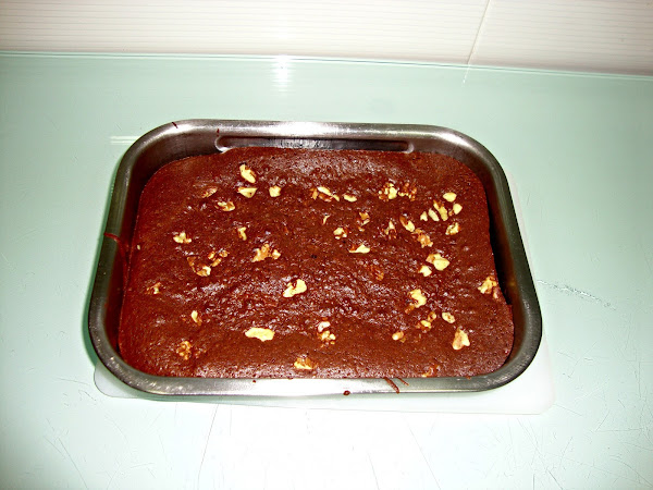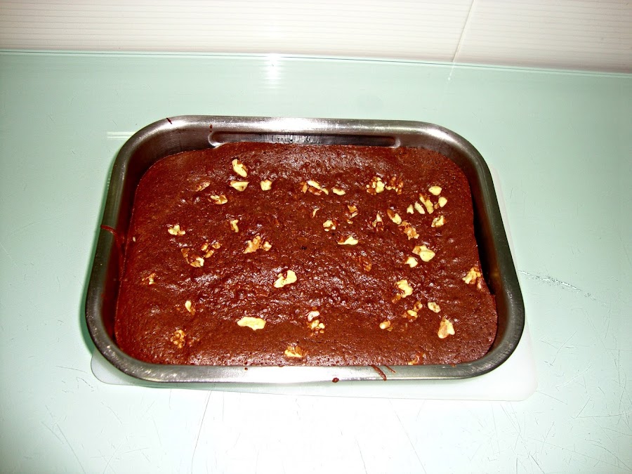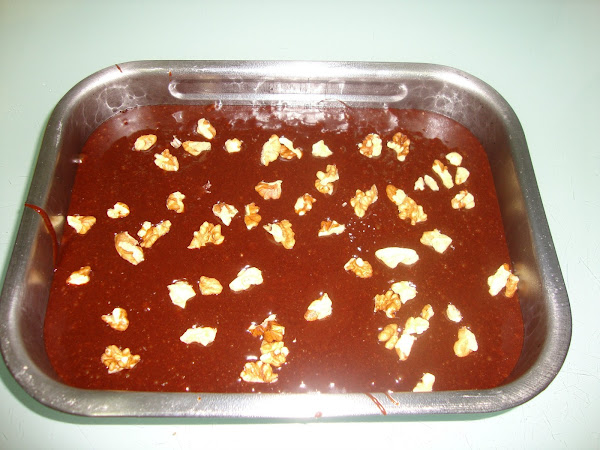 Ponemos en un molde de horno engrasado o forrado y añadimos las nueces (yo lo hago así para que si alguien no las quiere las pueda retirar) y lo metemos en el horno bajándolo a 180 ºC durante 25-30 minutos.