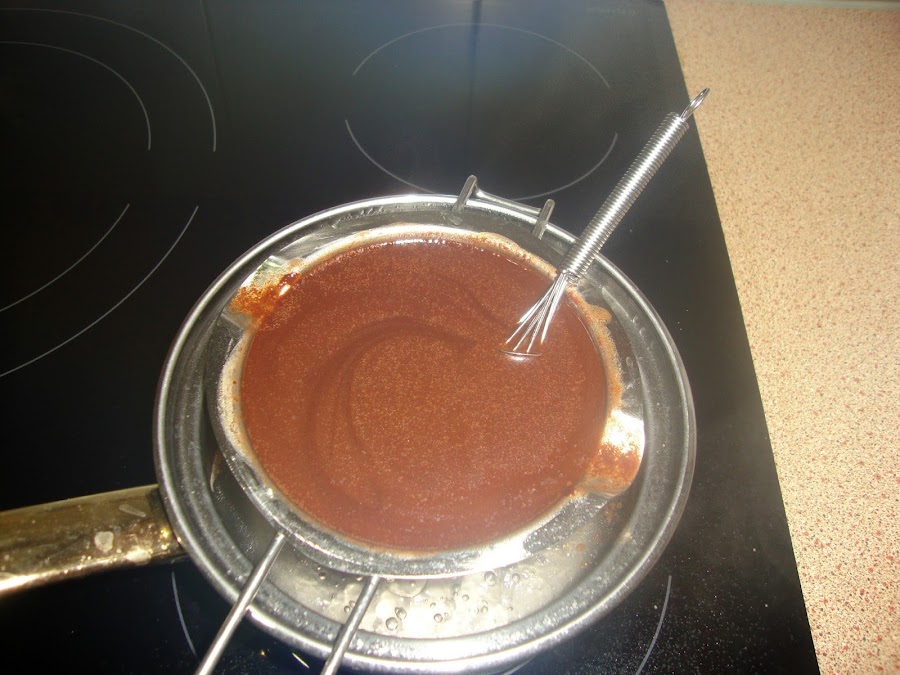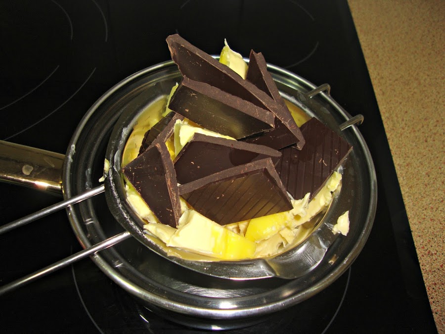 Ponemos un cuenco al baño María y derretimos a fuego medio la mantequilla con los dos chocolates troceados.
