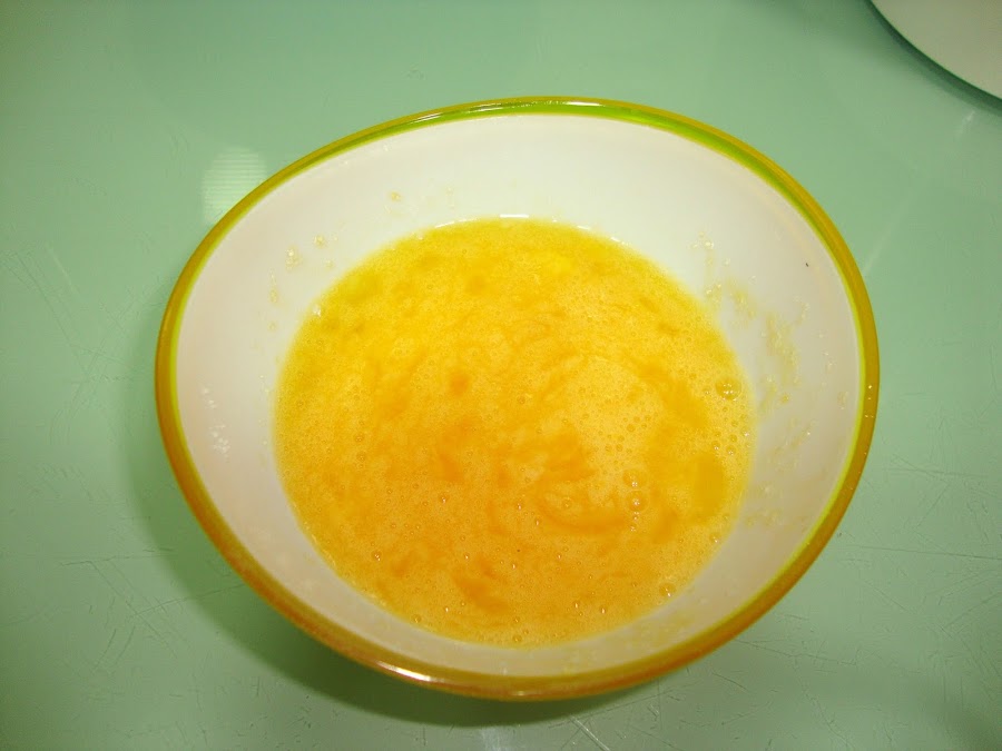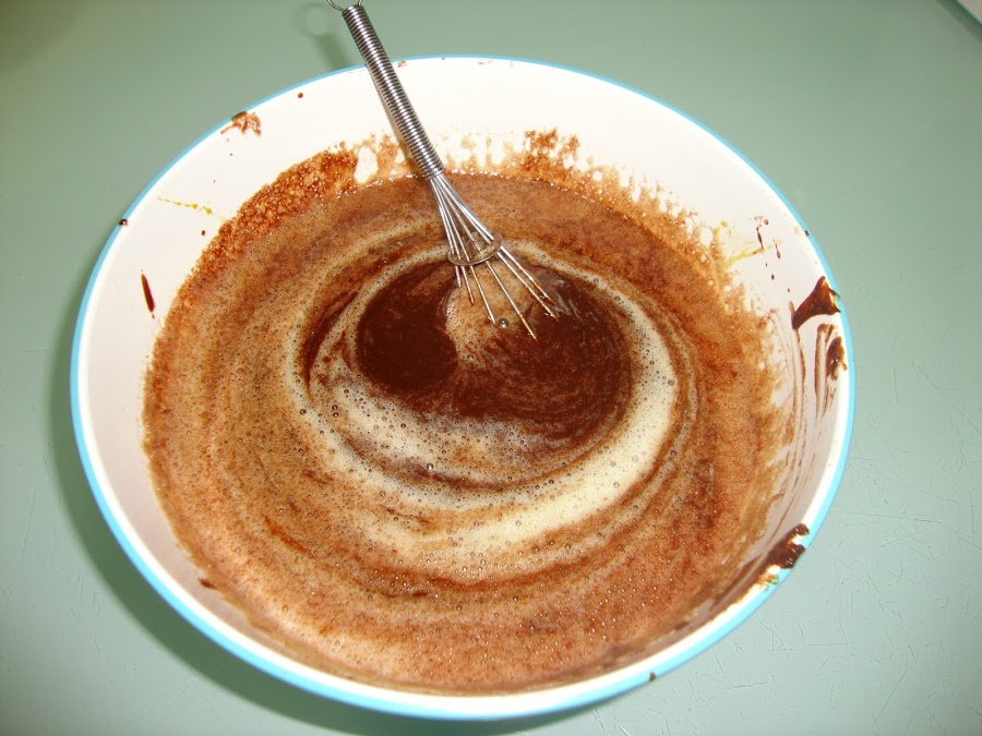 Batimos ligeramente dos huevos con la mitad del azúcar blanco (100 gr) y se lo añadimos a la crema de chocolate.