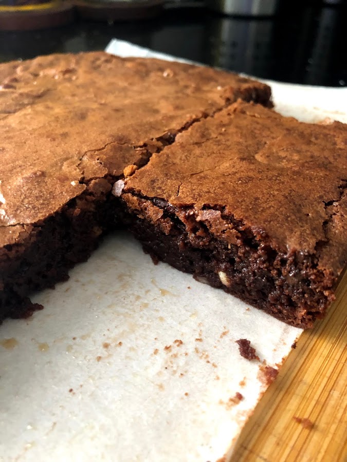 Precalentar el horno a 180º y preparar un molde para brownie, yo uso el de 20cm cuadrado de siempre, le ponemos papel de horno.
