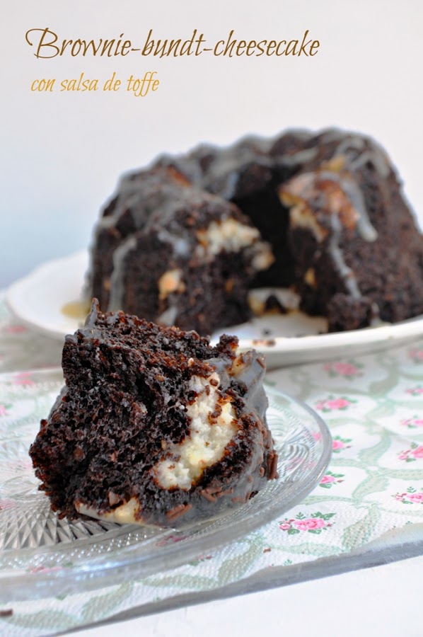 No sé cuando ni por qué apareció en mi cabeza, pero ahí estaba esperando a ser elaborado y probado. El resultado es mejorable, viendo las fotos que hay por ahí, pero al menos he dado el primer paso. No he visto ninguna receta en español así que al cosa se me ha complicado, pero un poco de aquí un poco de allí, he conseguido mi objetivo: un BROWNIE-BUNDT-CHEESECAKE. Un estupendo brownie con intenso sabor a chocolate relleno de una masa de queso y acompañado de una deliciosa salsa de toffe. Todo en un molde de bundtcake que son fantásticos para este tipo de bizcochos.