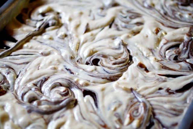 Para endulzar la masa del cheesecake, usé un poco de dulce de leche. Y como me gusta tanto el dulce de leche, le añadí unas cuantas cucharitas más a la masa del brownie y luego remolineé todo junto.