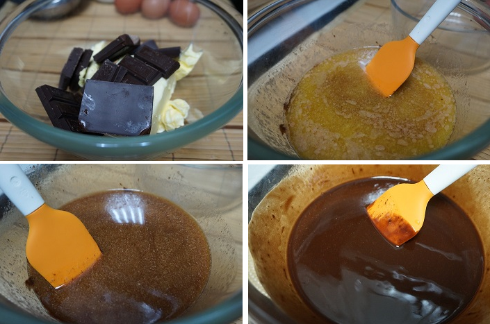 Empezamos con el brownie, fundimos el chocolate con la mantequilla en el microondas, lo removemos bien.