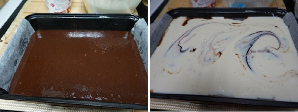 Ponemos en el molde la masa del brownie y encima la tarta de queso. Con la punta de un cuchillo haremos unos remolinos para mezclar la masa.