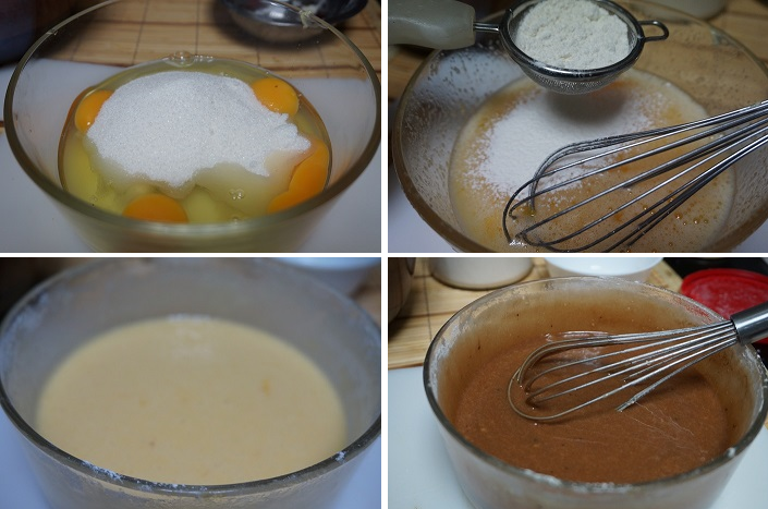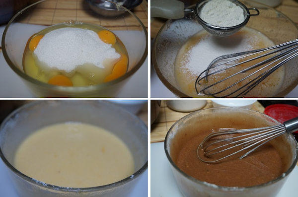 Cogemos un bol, añadimos los huevos y el azúcar lo batimos, añadimos la harina tamizada la integramos bien para que no queden grumos y por último integramos el chocolate que tenemos fundido. Reservamos.