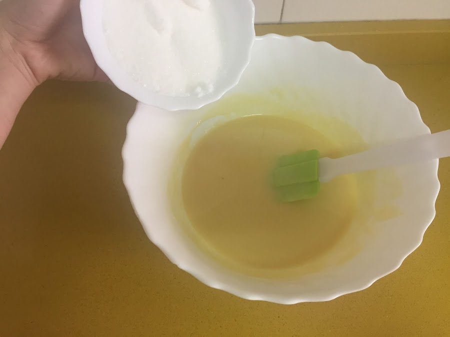 Cuando esté fundido el chocolate e integrada la mantequilla añadimos el azúcar, mezclamos y dejamos reposar hasta que baje un poco la temperatura.
