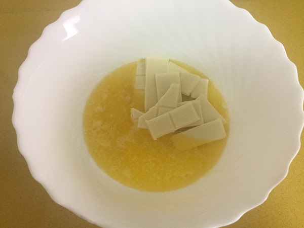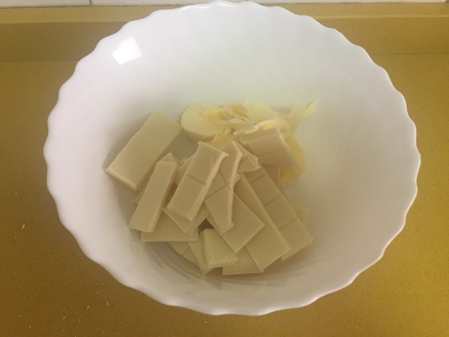 Derretimos en un bol, al microondas o al baño María, el chocolate blanco restante con la mantequilla.