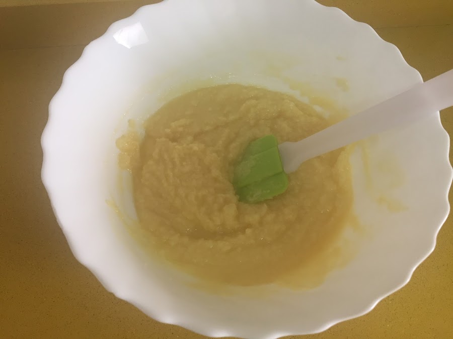 Agregamos los huevos, uno a uno, batiéndolos bien y después incorporamos la yema.