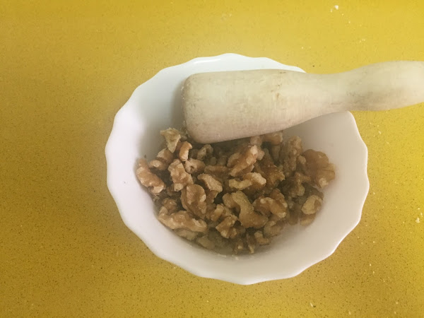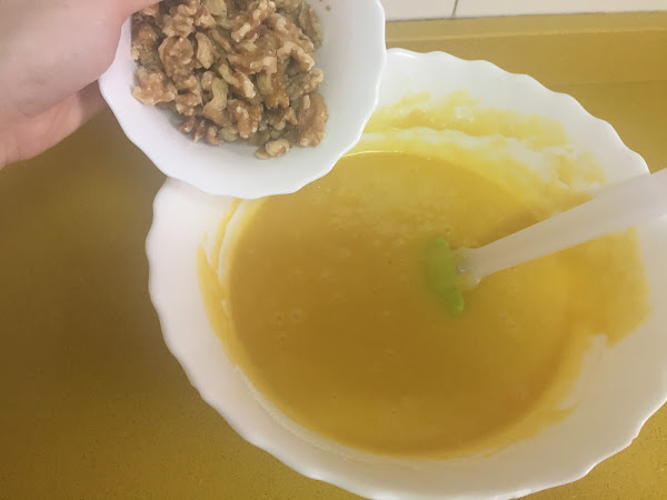 Molemos las nueces y las echamos junto con la pizca de sal, la harina, la levadurina y lo mezclamos todo muy bien.