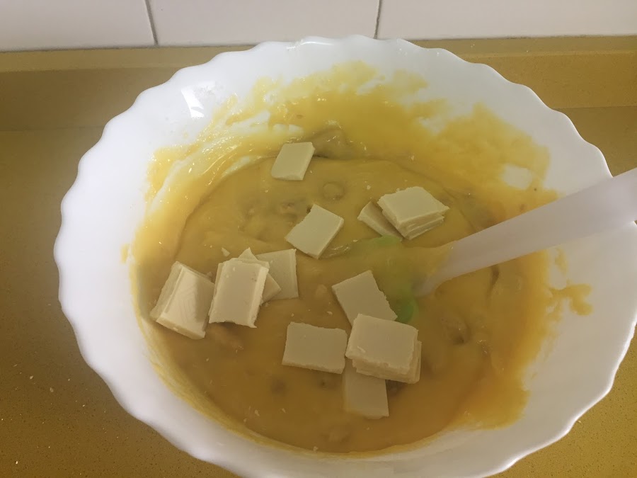 Añadimos los trozos de chocolates que reservamos, removemos bien para que se repartan por igual y vertemos la mezcla en el molde engrasado.