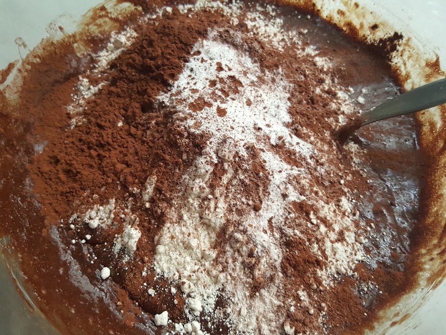 5. - Añadimos la harina y el cacao tamizados y mezclamos lo justo, hasta que quede todo impregnado.