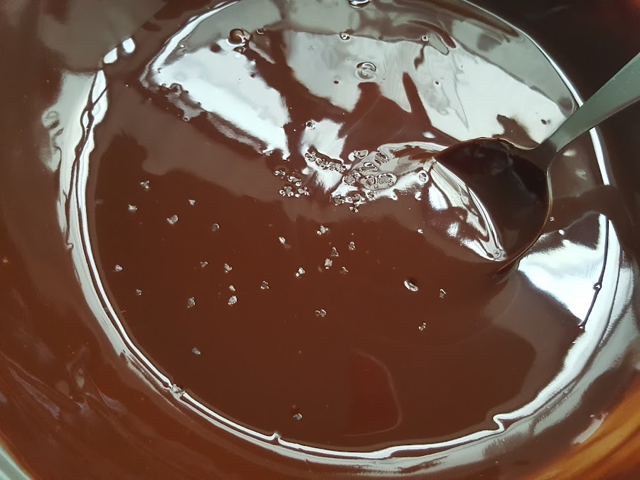 2. - Lo derretimos al baño maría o en el microonda de 30 en 30 segundos, hasta que quede todo bien derretido y mezclado y le añadimos la pizca de sal.