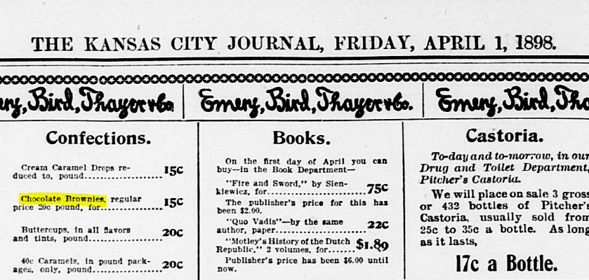 Varias fuentes, como el catálogo de Sears, Roebuck de 1897, citan la primera receta conocida de brownies. Pero no se trataba de un bizcocho de chocolate como lo conocemos hoy, sino de unos dulces de melaza. El nombre se le dio, también, por su color marrón oscuro.