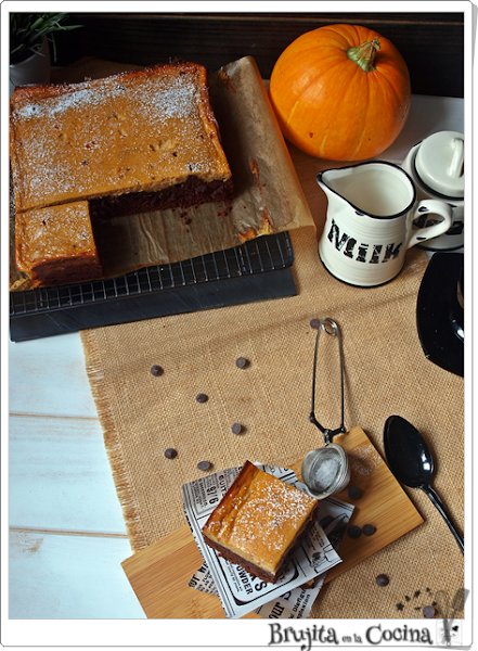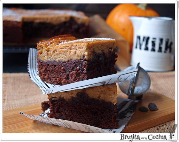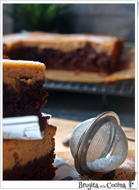 Las dos texturas, la de abajo bien chocolateada y por encima una crema de queso y calabaza, se hacen dos preparaciones muy fáciles, que ya sabeis que a mi complicarme la vida no me gusta, y que se hacen juntas en el horno, por lo que una vez dentro te olvidas hasta que te avise el reloj que hay que sacarlo.