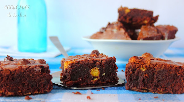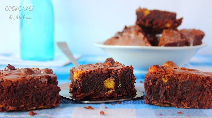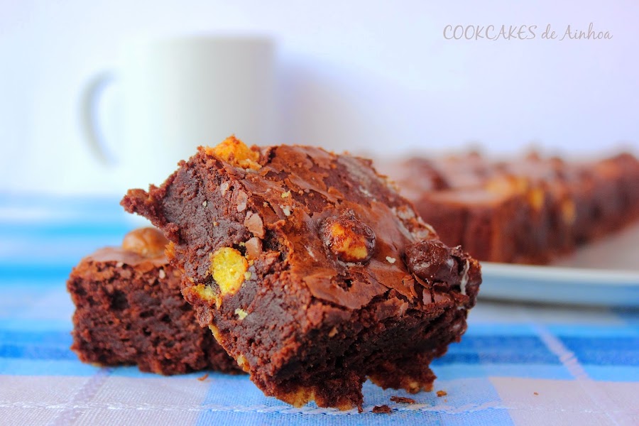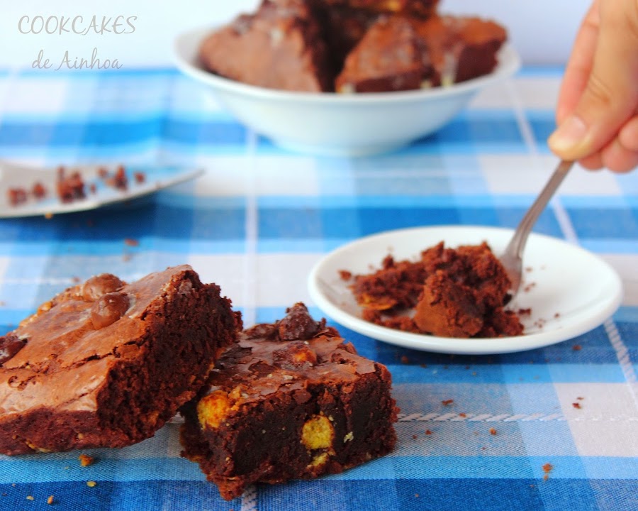 En cuanto a esta versión yo quise arriesgarme un poco y probar a añadirle los cereales (supuestamente crujientes) en la base del brownie. Debo reconocer que... fue un poco fiasco para mi! jajaja Me esperaba obtener una base muy crujiente, como cuando te comes los cereales directamente de la bolsa... pero no pensé que probablemente pasaría como cuando los hechas dentro de la leche, que se reblandecen! jajajajaja Problemas de principiante con ganas de inventar...