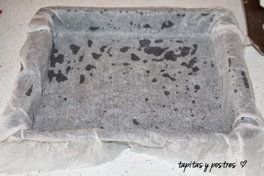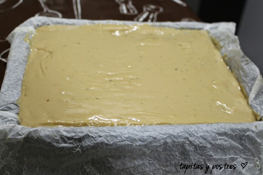 Cuando todo esté bien mezclado verter la masa en un molde rectangular al que habremos puesto papel vegetal mojado y escurrido ( para que se adapte mejor a las paredes del molde) y meter en el horno que previamente habremos precalentado a 160º unos 25 minutos.
