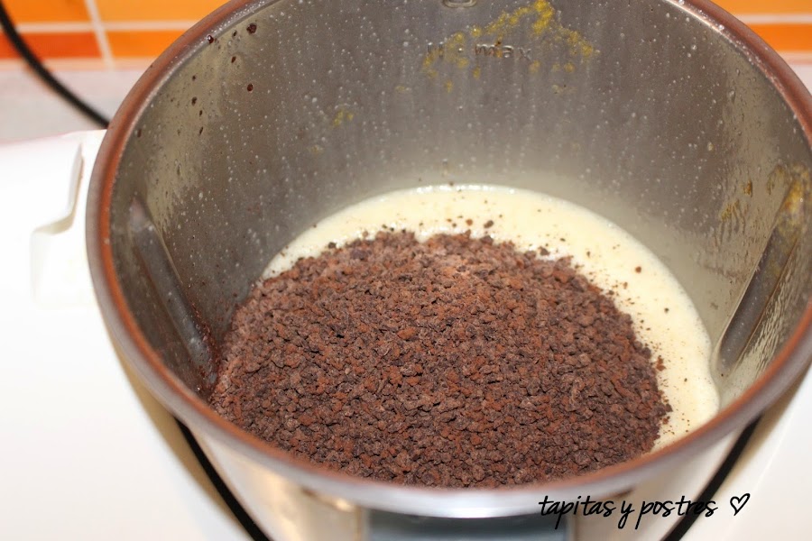 Echamos el chocolate en el vaso, como podéis ver he mezclado distintos tipos de chocolate (es lo que tenía). Lo trituramos.