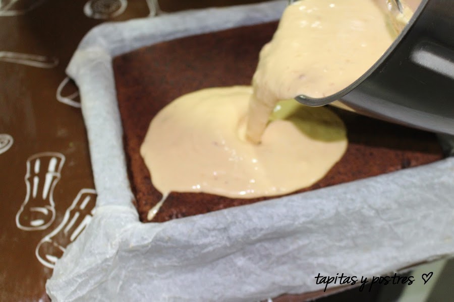 Con cuidado lo vertemos sobre el brownie frío. Un truco, dadle la vuelta al brownie, con cuidado, para que os quede la parte de abajo que es más lisa por arriba. Quedará mejor.