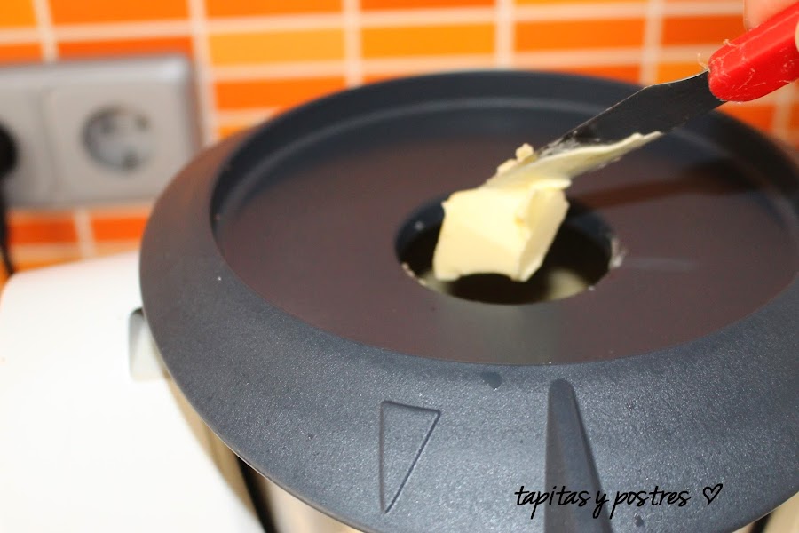 Cuando quede un minuto, parar la máquina y añadir la mantequilla a trocitos dejar que acabe y volver a mezclar dos minutos a velocidad 5.