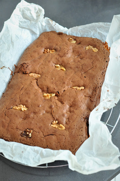 Montamos los huevos con el azúcar hasta conseguir un punto cremoso. Por otro lado derretimos el chocolate con a mantequilla y dejamos templar. Añadimos la harina tamizada a los huevos junto con la levadura y finalmente mezclamos el chocolate de forma suave. Añadimos las nueces troceadas excepto alguna más entera que dejaremos para poner por encima