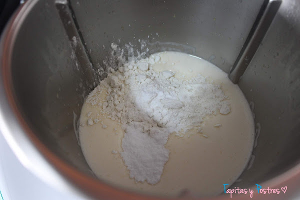 Una vez que los huevos están blanqueados, agregamos la harina y la levadura y mezclamos 20 segundos a velocidad 3 y 1/2.