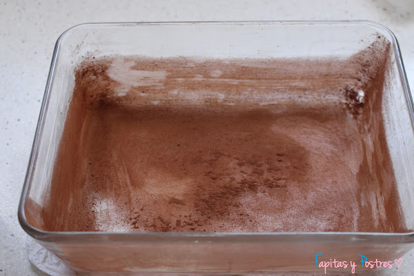 Engrasamos un molde apto para el horno con mantequilla y un poquito de cacao en polvo.