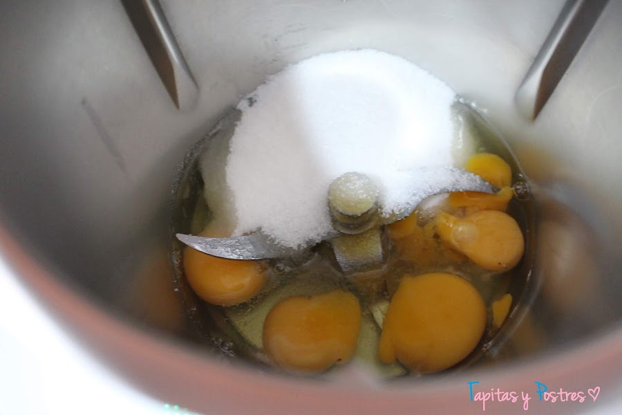 Primero vamos a blanquear los huevos en la thermomix con el azúcar durante 6 minutos a 37º y velocidad 3. Podemos hacerlo también con una batidora de varillas.