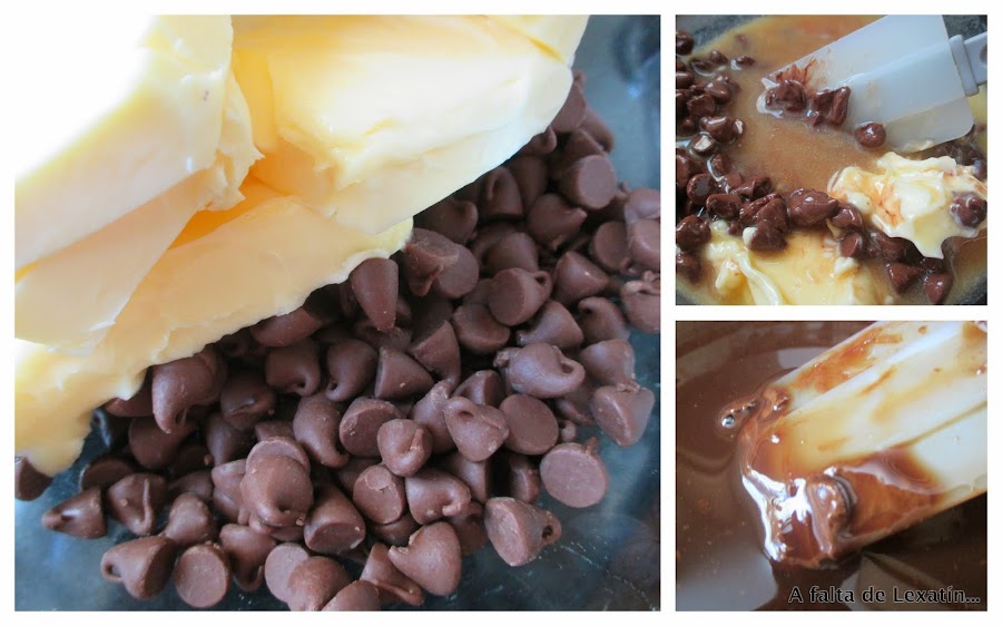Fundir el chocolate con la mantequilla al baño maría o en el microondas en "golpes" de 20 segundos. Remover y dejar enfriar un poco