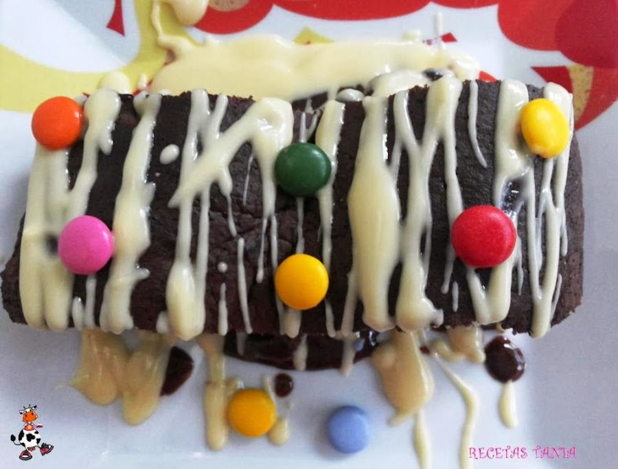 Metemos la fuente de cristal en el horno precalentado a 180º y lo dejamos unos 25min. (siempre dependerá del horno), pinchamos con un palillo y si sale limpio es que ya está listo. Los últimos 10min ponemos papel de aluminio para tapar el brownie para evitar que se queme y así quedará perfecto. Sacamos y decoramos al gusto,yo puse chocolate blanco derretido por encima y unos lacasitos.