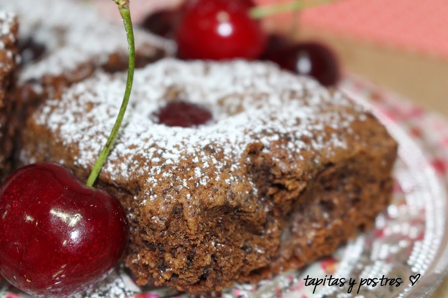 A finales de cada semana, acostumbro a llevar algo dulce al cole. Esta semana ha sido algo rápido, un brownie, pero con elemento distinto al habitual, las cerezas. Estamos en temporada y había comprado una cajita de cerezas con una pinta fantástica, así que a este brownie clásico con avellanas, le he añadido cerezas.