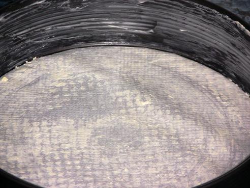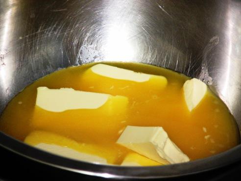 A partir de aquí ya viene todo rodado, se enciende el horno para que se vaya calentando a 180º, ponemos papel de horno en el fondo del molde y lo untamos de mantequilla. Mientras se derrite la mantequilla, ponemos en un bol los 5 huevos, los batimos con el batidor de mano (no quiero que entre mucho aire en la masa, por eso no utilizo el mecánico) y le ponemos el azúcar que batimos bien con los huevos para que se integre.