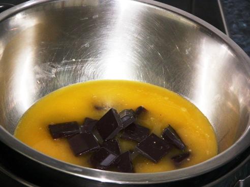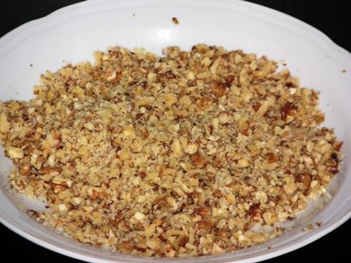 Lo cierto es que cuesta mas ponerse que hacerlo, yo me preparé todos los ingredientes, piqué las nueces con la ayuda del elemento picador de la batidora, dejándolas como podéis ver en la foto en trocitos pequeños. Corté en trocitos la tableta de chocolate y puse a calentar una cazuela con un poco de agua, puse encima del agua el bol metálico y puse a derretir la mantequilla al baño maría.